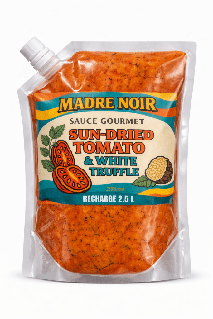 Madre Noir associe la rondeur de la tomate séchée à l’élégance aromatique de la truffe blanche, dans une texture lisse et onctueuse, sans excès de grains.